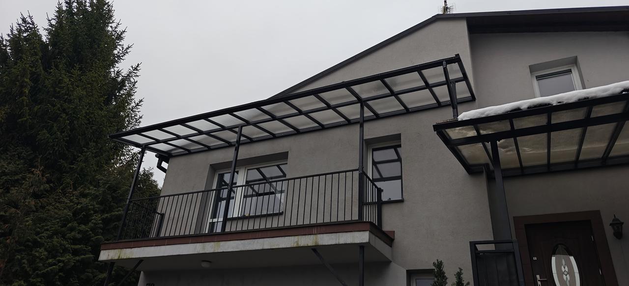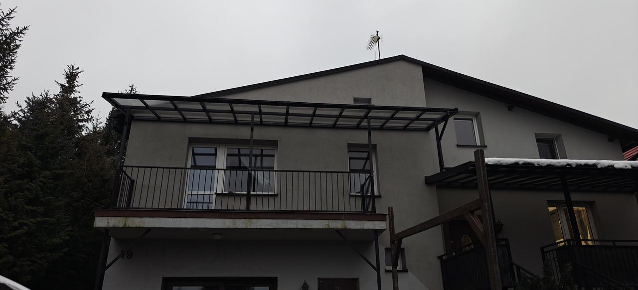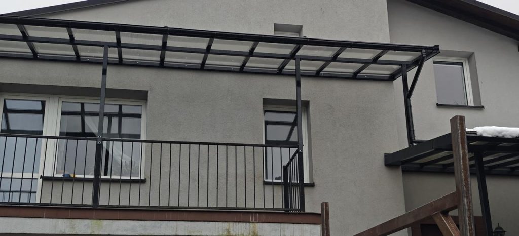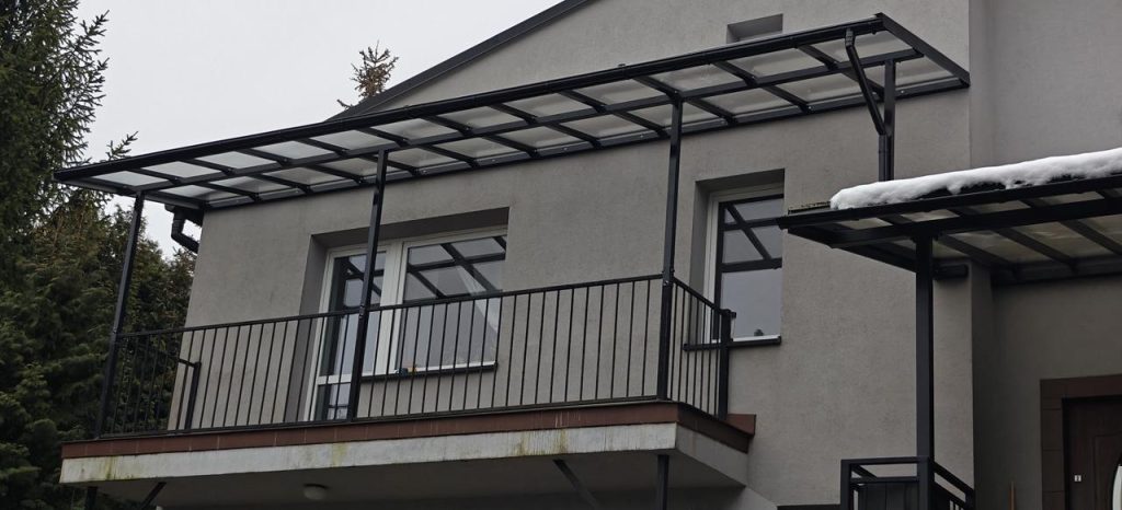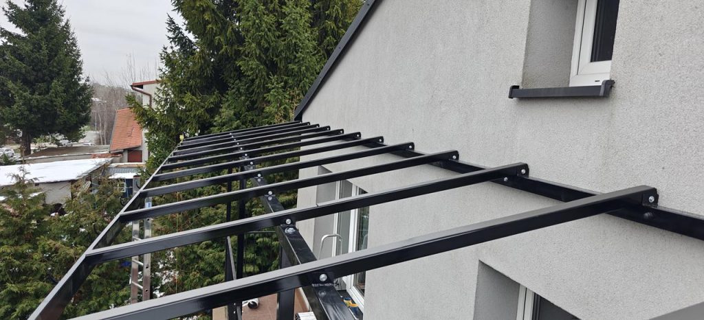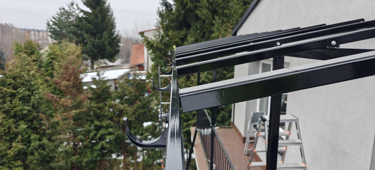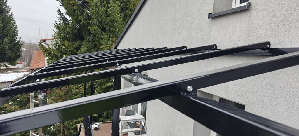Konstrukcja nośna wykonana jest ze stali ocynkowanej oraz malowana proszkowo na czarny błysk, co zapewnia maksymalną odporność na korozję, warunki atmosferyczne oraz obciążenia mechaniczne. Ocynk ogniowy gwarantuje trwałość na poziomie wieloletniej eksploatacji bez konieczności dodatkowej konserwacji. Dzięki temu zadaszenie balkonu jest stabilne, wytrzymałe i odporne na odkształcenia spowodowane wiatrem, śniegiem czy zmianami temperatur.